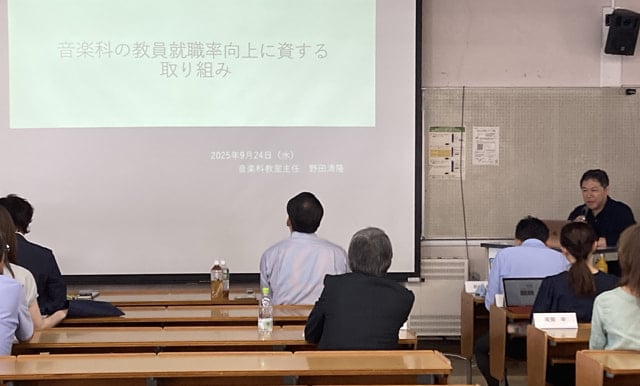9月24日(水)に今年で4回目となる教員就職に向けた研修会を開催しました。研修会では、音楽科教室における教員就職支援の取り組みが紹介されました。また、各教室の課題についてグループに分かれて討議を行い、情報共有を図りました。参加者からは、「日頃交流することのできない他の教科の教室で、教員志望の学生を育む取り組みがなされていることを知ることができて勉強になった」という声も聞かれ、有意義な時間となりました。