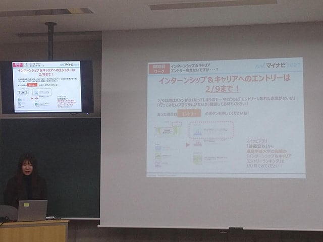1月14日(水)に「新4年生キャリア支援セミナー(企業・公務員志望者)」を実施しました。「就活直前スタート講座」と題して,就職支援会社マイナビの担当者から,就職活動について,いつ何を始めればよいか解説していただきました。参加した9名の学生は,説明会の内容のメモをとるなど熱心な態度で臨んでおり,「今何をすればよいのか、今後何をすればよいのかが明確に分かりました」,「漠然としていた「就活」についての理解を深めることができた」などの声がありました。
