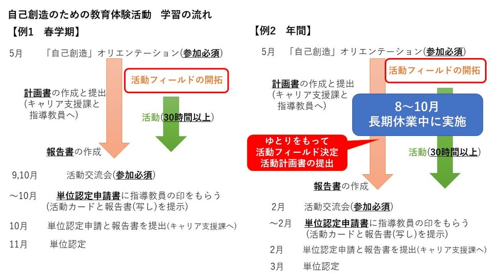 自己創造のための教育体験活動(以下、体験活動)の学習の流れを、春学期を例にして説明します。